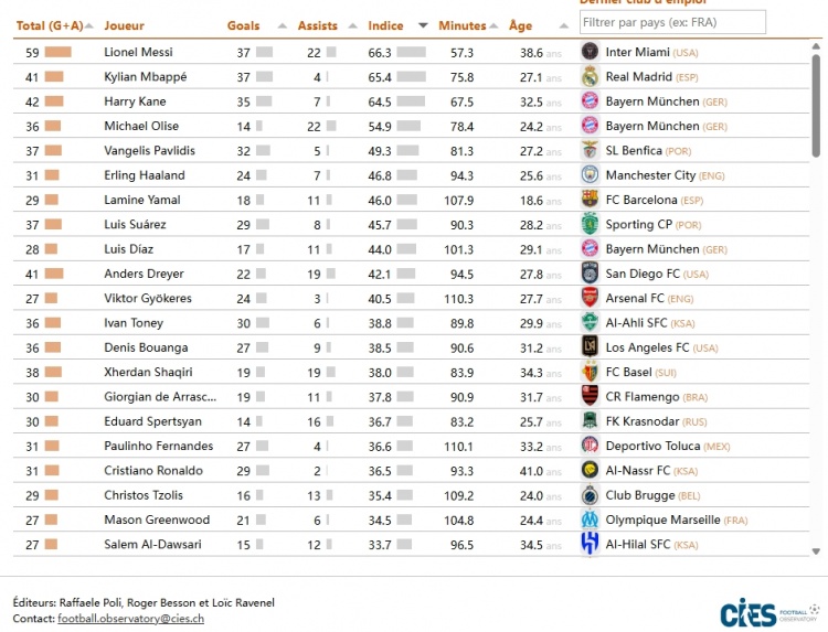 03月04日讯 瑞士足球媒体CIES足球天文台发布最新数据,统计了过去一年全球67个联赛中参与进球最多的球员。根据球员的贡献值与所在比赛的平均竞技系数进行加权计算后,梅西以59次参与进球(37球22助攻)66.3分的得分位列第一,姆巴佩以41次参与进球(37球4助攻)65.4的得分紧随其后,凯恩以42次参与进球(35球7助攻)64.5的得分位列第三。